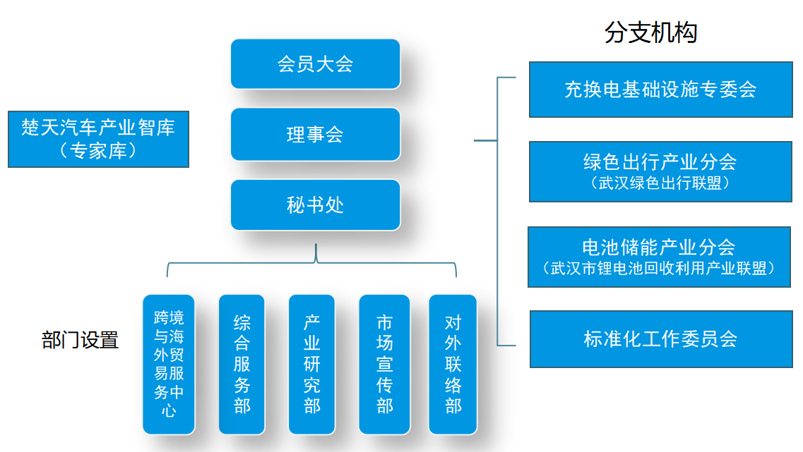 武汉市新能源汽车产业协会最高权力机构是会员代表大会,理事会是会员代表大会的执行机构,在会员代表大会闭会期间,理事会领导协会开展日常工作,对会员代表大会负责。